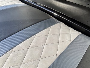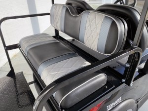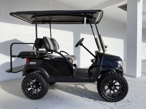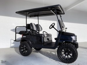 This Tidewater Carts exclusive Alpha Off-road Alpha body kit and custom seats on the Club Car Precedent golf cart is a real head turner. This body kit includes automotive style flush mount LED headlights and taillights. Plug and Play Wiring Harness, Color infused plastic with a high-gloss scratch resistant clear coat finish. This unit has the upgtraded offroad style ALPHA logo in matt black.