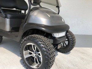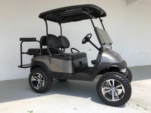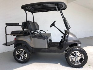 This custom lifted charcoal golf cart with bluetooth radio is built on an Aluminum Frame for longer life. The lighweight frame is rustproof even in salt air and made to be more impact resistant than steel. It preserves the life of your cart and enhances the stability, ride and performance. This golf cart is economically priced and fun to drive. You can even accessorize this vehicle with many options.