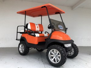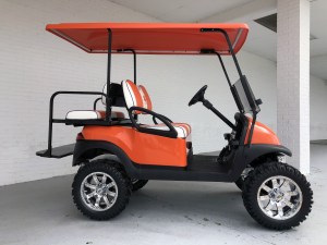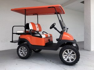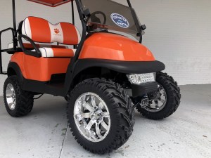 This lifted Clemson color Club Car Precedent golf cart is a real head turner. The Club Car golf cart is built on an Aluminum Frame for longer life. The light weight frame is rustproof even in salt air and made to be more impact resistant than steel. It preserves the life of your cart and enhances the stability, ride and performance. This golf cart is economically priced and fun to drive. You can even accessorize this vehicle with many options.